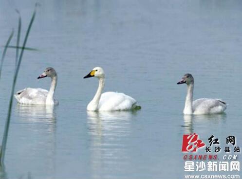 松雅湖良好的环境吸引不少鸟类驻足,三只天鹅正在悠闲地戏水。余敏 摄