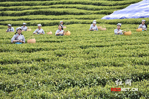 上午10点,在雄浑的“千两茶号子”声中,采茶姑娘和茶农们进入茶园,开园仪式正式开始。“茶山姑娘俏模样,十指尖尖采茶忙”,只见采茶姑娘们笑脸如花,翘起的兰花指如翩翩飞舞的蝴蝶,姿态曼妙,吸引了众多嘉宾的目光,摄影师们“咔嚓,咔嚓”拍下了美好的镜头。
