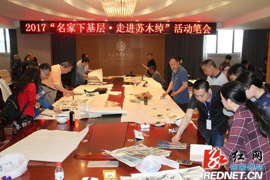 笔会现场,各位名家挥笔泼墨,笔走龙蛇,妙绘丹青,纷纷临场献艺。有个性张扬的草书、法度严谨的隶书、漂亮的山水画、意境深幽的水墨画、传统的花鸟画,展示了书画家们各自的绝技和风采。特别31名画家联合绘制的两幅分别长达2.43米的国画山水“印象苏木绰”、国画花鸟“春酣苏木绰”更是吸引所有人的眼球。