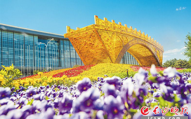 据了解,《丝路金桥》长28米、高7.2米,被色彩缤纷的鲜花簇拥。由鲜花形成的五彩丝带花毯,如同百花园,其中的紫蓝色与金黄色分别象征着陆上丝绸之路与海上丝绸之路。舒勇以丝绸为材料,以手工绢花的制作工艺,制作出“一带一路”范围内国家50多种国花和市花,采取人工琥珀的工艺融嵌成一块块的“丝路金砖”,搭建了一座以“赵州桥”为基本形态的金色琥珀桥梁,向世界传递着中国期望通过与世界各国一同践行“一带一路”倡议,构建人类“命运共同体、利益共同体、责任共同体”的美好愿望。