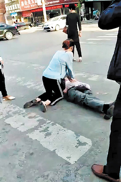 9日晚,浏阳的微信朋友圈流传着一段10秒的短视频:一位老人躺在地上,一名身穿蓝色针织衫的女子跪在地上,双手有节奏地按压老人胸口,努力挽救老人的生命。