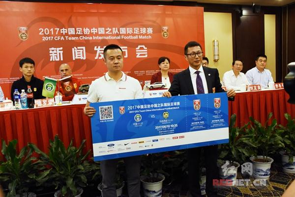 红网湘潭站5月12日讯(记者 焦炬)5月12日下午3点,2017年中国足协中国之队国际足球赛--中国U-22国家男子足球队对阵马来西亚U-22国家男子足球队的赛事新闻发布会在湘潭举行。本次发布会确定了门票发售时间、发售渠道,并展示了票样。中国足协竞赛部部长戚军、中国U-22男子足球队第一助理教练德罗索、湘潭市人民政府副市长刘永珍等出席了发布会。