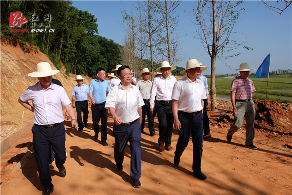 市委书记喻文(中),市委副书记、市长朱平波(前排右一)督查屈子文化园项目建设