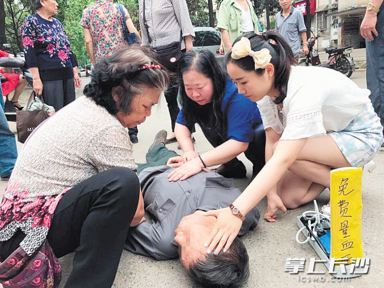 “急用一下,马上还给你。”刘锦文是该院的一名工作人员,以前是护士,当时她刚好下楼,远看有一群人围在一起,隐约听说有人晕倒了。恰好看到路旁有免费测血压的摊桌,她拿起血压计就跑向现场。此时,在医院从事行政工作的李青莲也上班路过,看到有人倒地,她赶紧折回,当时谭丽芬正在为老人做初步检查,她赶紧拨打了120。