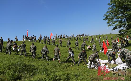集训期间,鼎城区防汛指挥部组织专家对区防汛抢险大队200人进行了管涌险情处置业务知识培训,并进行模拟因沅水水位长时间超过保证水位,导致沅水大堤出现管涌群,区防汛抗旱指挥部立即启动应急预案,迅速命令区防汛抢险大队赶往管涌险点抢险。抢险队在防汛抢险大队长、鼎城区人武部副部长徐建新的带领下,不到30分钟跑步赶到管涌险点,并迅速开展抢险行动,采用用沙袋沙石构筑反滤井法排除险情。经过30分钟的奋战,构筑了5个直径为3米,高0.8米的反滤围井,险情得到有效控制。