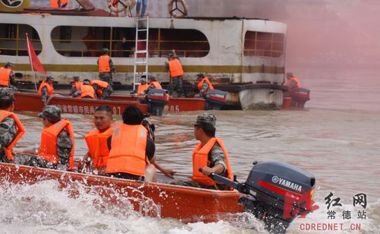 同时,还组织了演练,进行冲锋舟编队航行、夜间编队航行,水上救援行动,孤岛救援行动,被困群众救援行动。在沅水三桥至德山二广高速沅水大桥之间的复杂水域编队航行,一字横队、一路纵队、两路纵队、前三角队形、后三角队形、左右梯形设置各种突发险情。