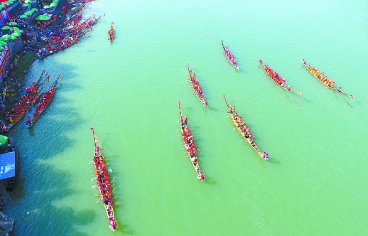5月27日,龙船在道县潇水河上角逐。当日,道县一年一度的“道州龙船赛”在潇水河上开赛,来自全县的98艘龙船将展开为期4天的激烈角逐。“道州龙船赛”2006年被列入湖南省非物质文化遗产名录。 何红福 摄