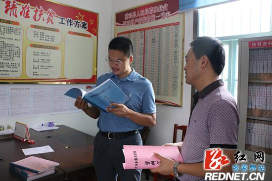 高靖生(左)查看贫困村建档立卡贫困户台账资料。