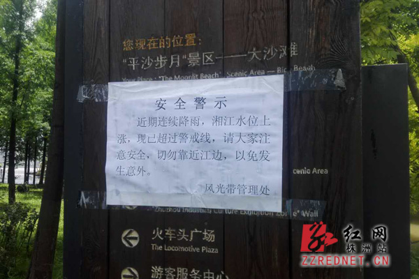 湘江风光带管理处提醒各位市民:现在正是洪峰过境时段,湘江水位已超过保证水位,切勿超过警戒线下河玩水,以免发生意外。