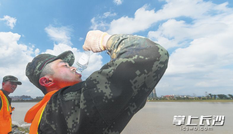 7月4日下午,天气炎热,浏阳河堤上,加固河堤的武警官兵满头大汗,志愿者为他们送来纯净水。
