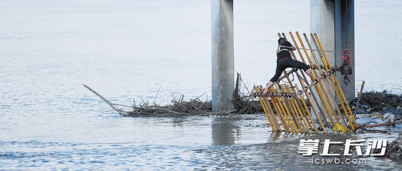 7月4日下午,浏阳河竹沙桥泵站闸口,工作人员正在吊装铁架。