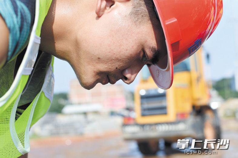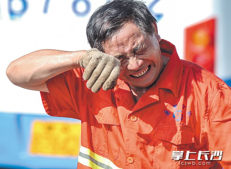 ↑昨日下午,在金星南路上,岳麓区市政工作人员戴新桥在高温下抢修路面,他咬着牙正在擦流到眼里的汗水。
