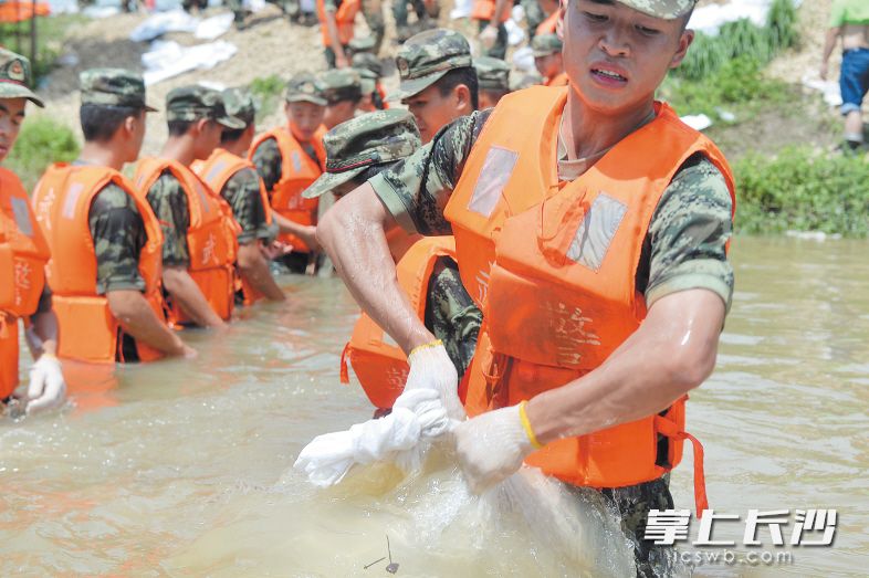 7月4日下午,浏阳河竹沙桥泵站闸口,武警官兵在烈日下加固河堤。