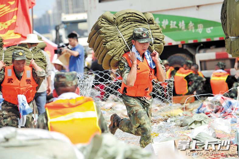 7月3日0时12分,湘江长沙站洪峰水位39.51米,超过历史最高水位(39.18米,1998年6月27日)0.33米,超保证水位(38.37米)1.14米,超警戒水位3.51米。湘江及其支流险情频发,一场场抗洪抢险救灾的硬仗随之打响,武警官兵、消防战士、党员干部、普通群众、志愿者等各路抗洪大军开赴险点、险段,装沙包、扛沙袋、打木桩、堵涌口……抗洪决战在争分夺秒中进行,救灾转移在与时间赛跑中展开。