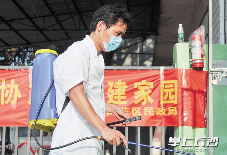 →昨日下午,雨花区跳马镇团然村临时安置点——团然幼儿园内,卫生检疫组的工作人员在消毒。