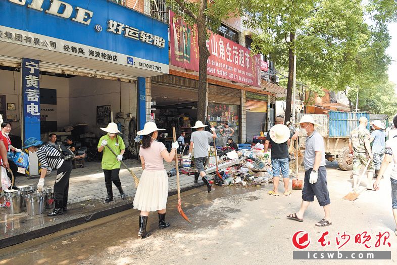 前日下午,宁乡县城白马桥街道的大街上,工作人员和志愿者正在清理垃圾。