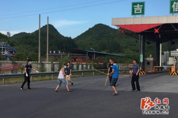 当天18时,凤凰县公安局吉信派出所接吉信镇收费站报警称:“有两名蒙面劫匪正在持刀抢劫收费站,请出警处理”。民警接警后快速反应,派出所负责人带领全体民警赶赴现场后迅速作出部署,将警力兵分两路,一组民警负责吸引在收费亭门外持刀望风的歹徒,另一组民警负责制服正在收费亭内抢劫现金的歹徒。民警与歹徒斗智斗勇,找准抓捕时机果断将两名蒙面歹徒制服。演练结束后,派出所负责人还向收费站全体工作人员详细讲解了防盜抢知识以及遇到类似紧急情况的处置方法、注意事项等内容。