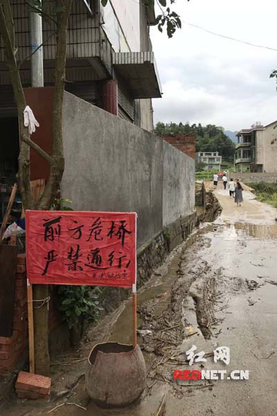 由于洪水浸泡,长铺子乡一座小桥变成了危桥,车辆尚不能通行。