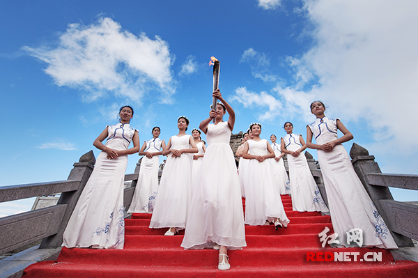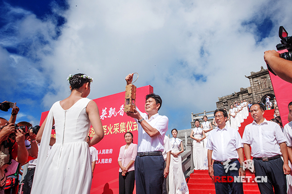 圣女虔诚地取下熊熊圣火,庄严地将火种递给衡阳市副市长杨龙金。