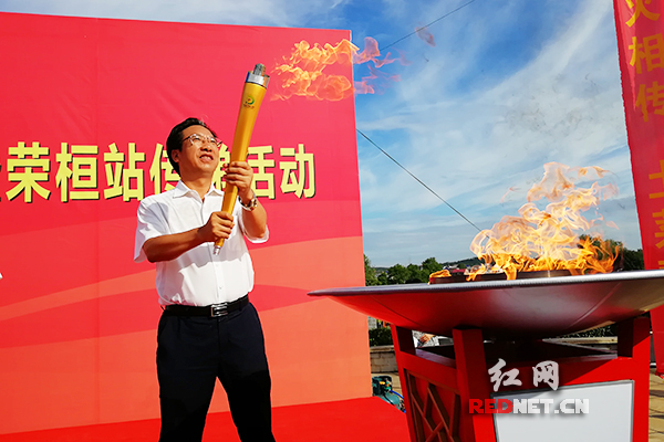 衡东县委书记吴伟生在圣火盘上点燃圣火火炬。