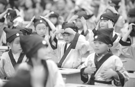 9月4日,长沙市雨花区砂子塘吉联小学举行了一年级新生入学开笔礼活动,新生为自己正衣冠。 图/潇湘晨报记者辜鹏博