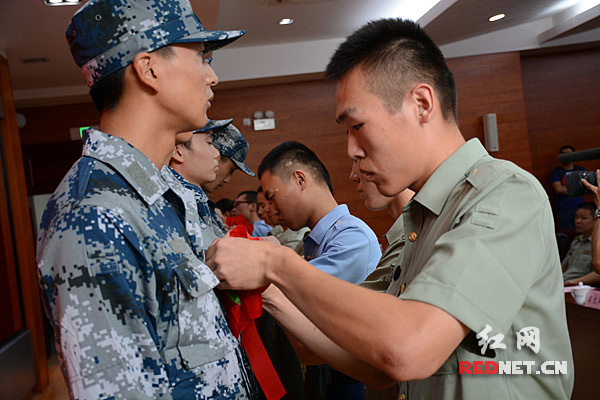 退役学生代表为每名应征大学生佩戴上鲜艳的大红花。