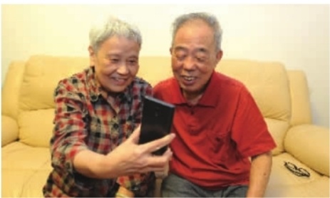 9月6日,邓振球老师(右)和爱人正与学生张宏进行视频聊天。傅聪 摄