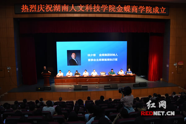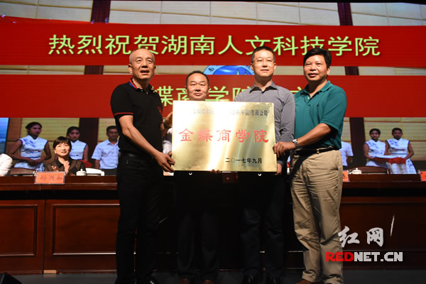 湖南人文科技学院校长刘和云,金蝶集团董事局主席徐少春为金蝶商学院授牌,金蝶商学院首任院长朱强、副院长刘建接牌。