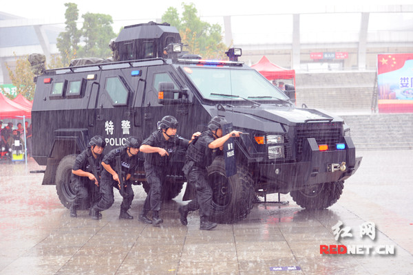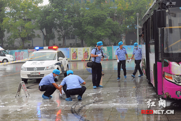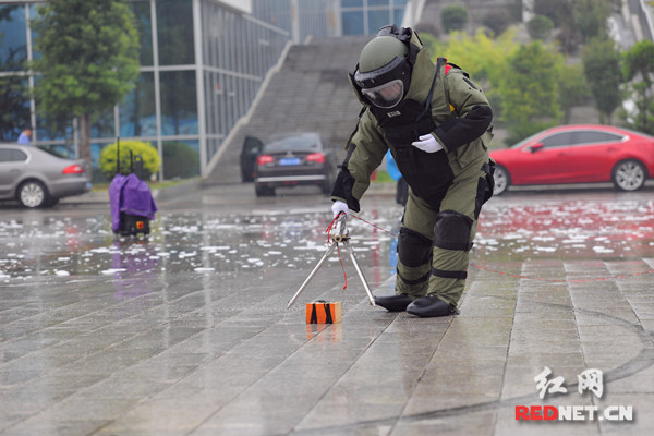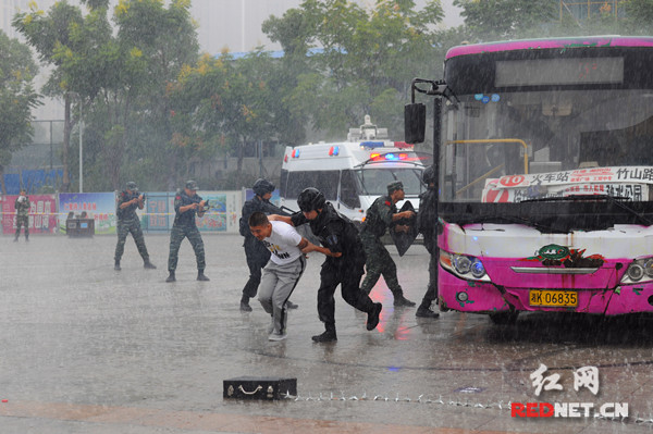这是湖南省娄底市公安局、市反恐办在市体育中心北广场联合组织开展处置公交车暴恐事件演练中的一幕。“暴恐事件”发生后,娄底多警联动、快速反应、迅速处置,把“恐怖分子”当场制服,成功将“炸弹”转移至安全地带进行引爆。