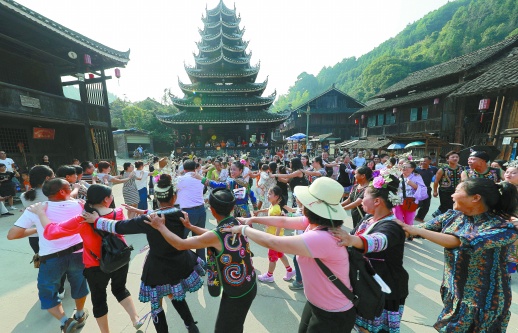 时刻新闻 —分享— 10月3日,通道侗族自治县双江镇芋头村侗寨,村民与游客一起跳着欢快的侗族舞。近日,来自国内外的游客利用国庆、中秋长假纷纷来到侗乡,感受侗寨民俗魅力。 刘强 摄 来源:湖南日报 编辑:高芹