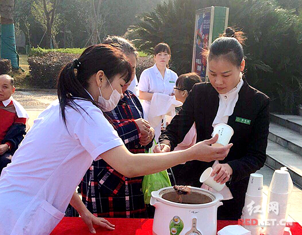 爱心义诊展台上,工作人员为老人送上爱心粥。