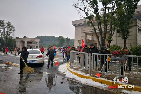 为确保湖南省两会顺利召开,在街道工委书记向志武、办事处主任张毅的带领下,青园街道机关干部集中对新韶路沿线的积雪、冻冰进行了清除。大家不畏严寒,冒着雨雪,手持铁锹、扫帚等劳动工具积极投入除雪的行动中。