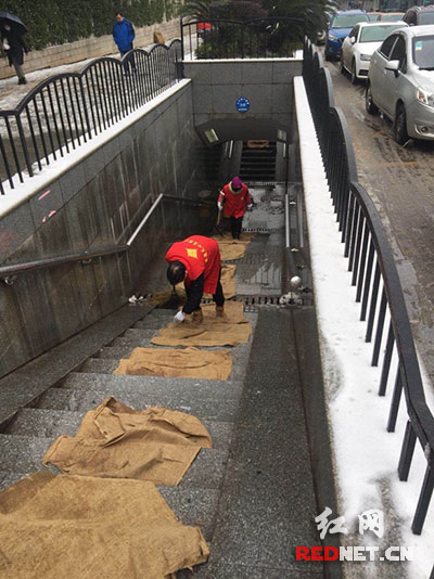 各社区除组织工作人员、志愿者上阵外,更广泛发动居民、商户清扫背街小巷、居民小区门前的积雪。青园社区专门组织力量,对青园小学校门路面积雪进行清除,在地下通阶梯上铺设麻袋,为孩子上下学开辟安全通道。