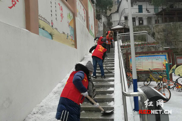 1月26日一大早,长沙市天心区裕南街街道便组织全体机关干部、社区工作人员、青年志愿者和辖区共建单位的党员干部职工开展铲雪除冰活动。