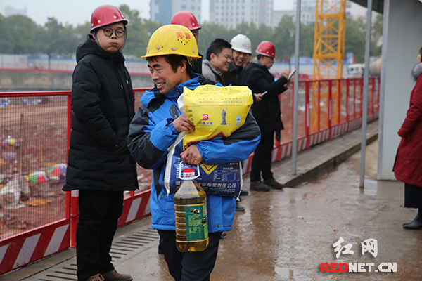 一名建筑工人收到慰问物资。