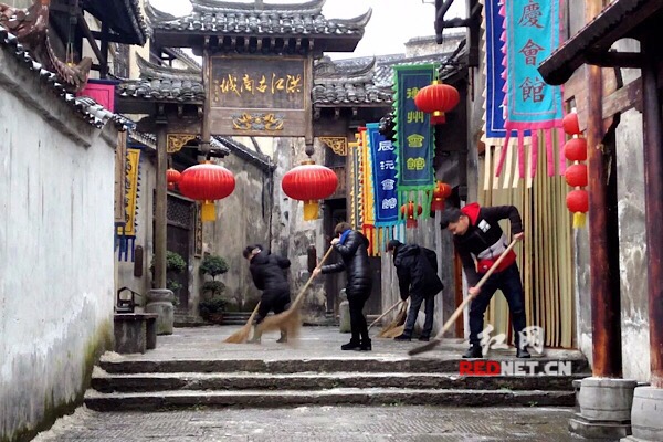 因雨雪冰冻天气影响,交通道路和景区内普遍冰冻路滑,为防止对出行造成安全危害,景区今日暂停营业,所有员工紧急出动,对古城巷道进行冰雪清扫,清除隐患。