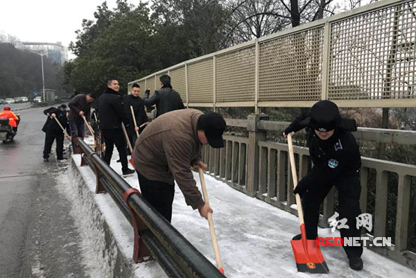 为消除交通安全隐患,保障市民出行安全,株洲石峰区城管大队立即启动低温雨雪天气防范应急预案,石峰城管大队大队长康久清组织50余名队员赴响田桥铲雪除冰。下午5时许,响田桥人行道上结了3厘米厚的冰,队员们身着雨衣,冒着严寒,用铲子将桥面人行道上的冰全部铲除干净。
