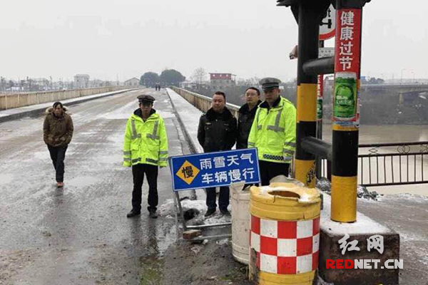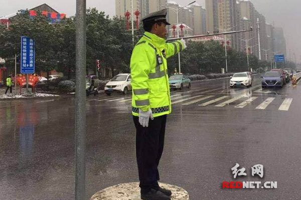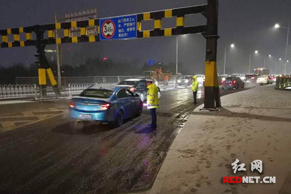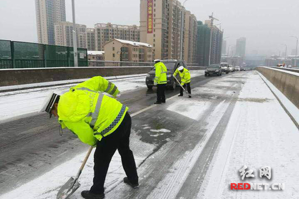 红网时刻衡阳1月30日讯(记者 宋美君 通讯员 陈小平)1月28日,衡阳迎来了2018年的第一场雪。银装素裹的美景给市民带来了兴奋和欢乐,但连日来的低温雨雪,造成桥梁、道路大面积结冰,给道路行车安全带来了严峻挑战。为确保道路交通安全,衡阳市珠晖区交警按照冰冻雨雪天气工作预案,提前启动一级勤务工作机制,取消周末休假,实行24小时轮班巡查排险,上路抗冰保畅。