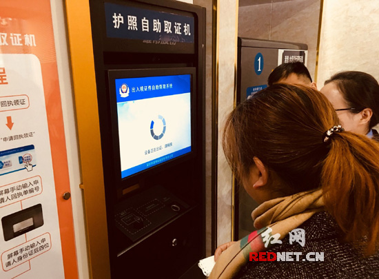 在宁乡市公安局“为民服务中心”服务审批分中心24小时自助区,新增设的港澳通行证自助取证机前,一市民正在自助取走自己的护照。