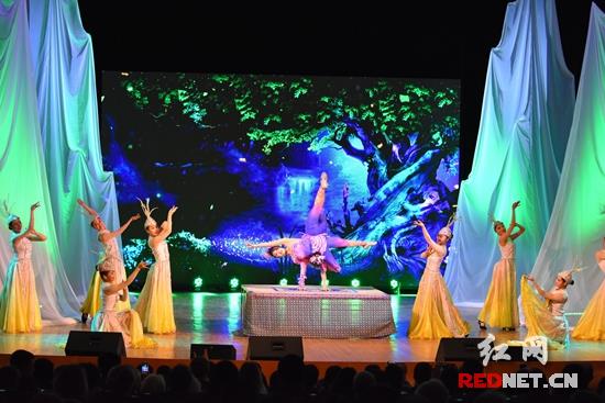 演出现场气氛热闹,掌声不断。张家界魅力湘西艺术团精心编排的《山水之恋》《马桑树儿搭灯台》《追爱》《傩面茅古斯》《哭嫁》等极具湘西少数民族特色的舞蹈、杂技展示了原生态的湘西民俗风情,让现场观众一饱眼福。同时,武陵源景区旅游形象大使、张家界魅力湘西青年歌手阿朵还特意带来了一首白俄罗斯民歌《库帕林卡》。