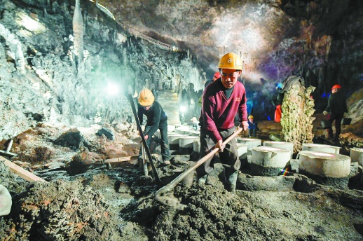 2月3日,张家界西线旅游九天峰恋旅游区,工人在九天洞内施工。向韬 摄