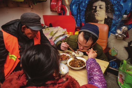2月7日,原长沙商标线带厂内的一处民房,徐巧明正给儿子谭轩夹菜。图/潇湘晨报记者 杨旭