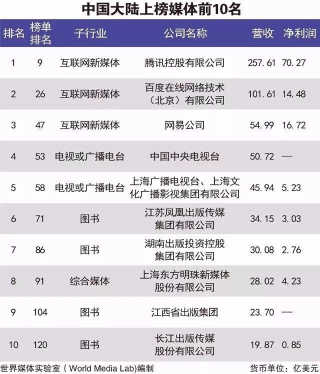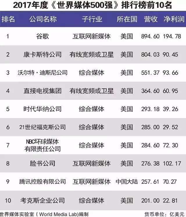 来自美国的谷歌(Google)荣登冠军,营业收入高达894.60亿美元;康卡斯特(Comcast)排名第二;迪斯尼公司(Walt Disney)排名第三。入选榜单前十名的媒体公司,有9家来自美国,另一家为中国的腾讯。
