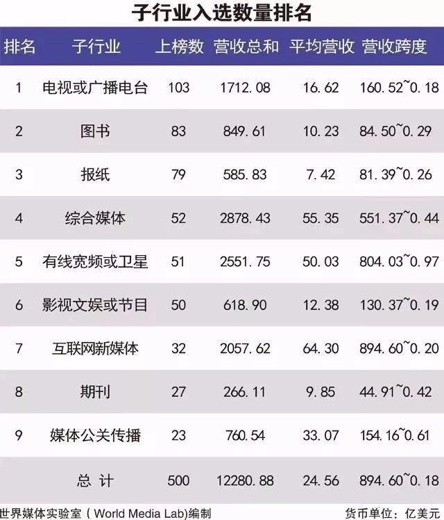 该排行榜评判的依据是媒体公司2016年的营业收入,人为因素较少,具备公正性和权威性。榜单涉及电视或广播电台、报纸、图书、期刊、互联网新媒体、有线宽频或卫星、影视文娱或节目及媒体公关传播共9个子行业。研究对象覆盖美洲、欧洲和亚洲40多个国家和地区的3000多家媒体公司,最后按照营业收入的大小确定前500名媒体公司,平均收入为24.56亿美元。