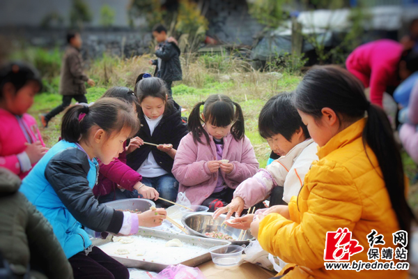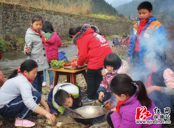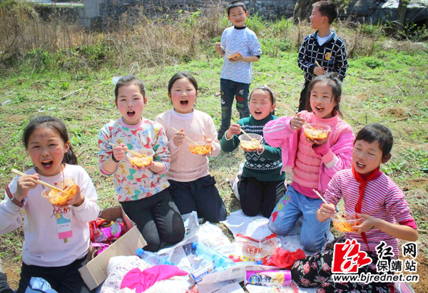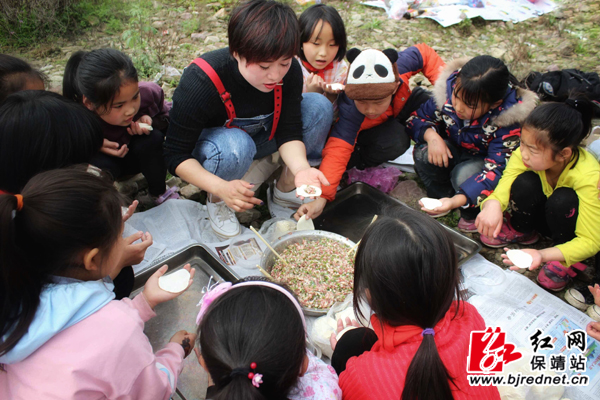 上午9时30分,春风微微吹,太阳慢慢地露出了笑脸,学生们在老师和部分学生的家长的带领下,举着队旗浩浩荡荡出发了。一路上,大家一边唱着儿歌,一边呼吸着大自然的新鲜空气,一路上欢呼声、雀跃声此起彼伏,到处是愉悦的画面。来到了指定的地点,学生们按照班主任老师的安排开始分工合作,有的洗菜,有的烧火做饭,有的捡柴,有的包饺子,大家都忙得不亦乐乎……