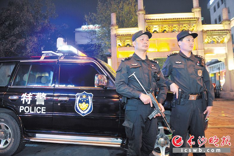 昨日20时许,太平街口,人来人往,一辆特警执勤车在旁边警灯闪烁。长沙市公安局特巡警支队第五特警大队二中队中队长熊剑宏及队员王浩伟正在此武装值守,他们一人手持79式微型冲锋枪,一人手持92式手枪,腰间上还挂着催泪喷雾剂、警棍、手铐等装备。