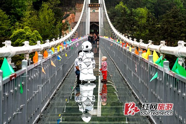 在玻璃桥上,智能机器人导游试岗,为游客指路。