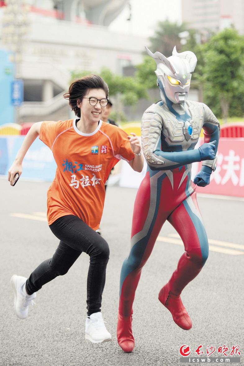 女跑友与“奥特曼”一起在春天奔跑。均为长沙晚报记者 余劭劼 黄启晴 摄影报道