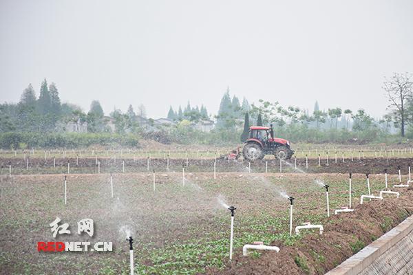农田里采用全自动喷灌技术。
