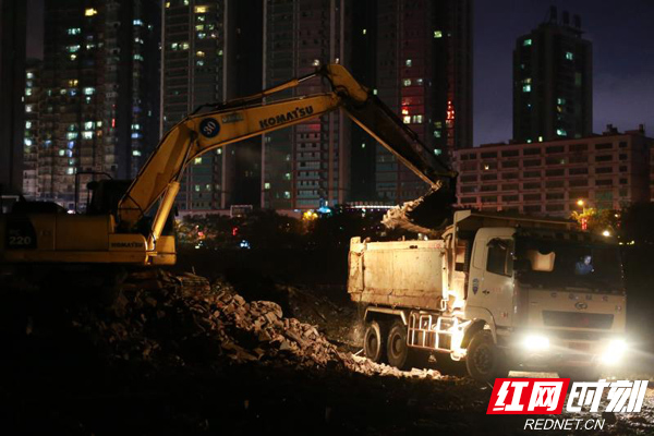红网时刻衡阳5月13日讯(记者 王敏 通讯员 罗飞虎 陈毅)“三台挖掘机不间断作业,八台渣土运输车来回穿梭。”5月12日晚8时,衡阳市石鼓区蒸水北堤老船厂建筑垃圾堆存点现场,工作人员正在紧张有序地指挥垃圾清运处置工作。